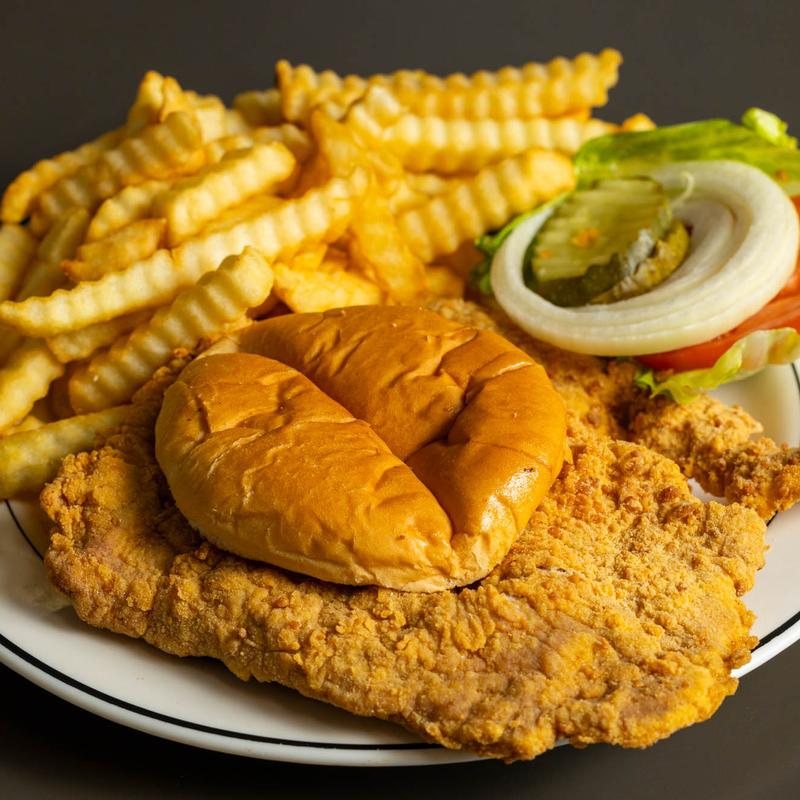 Lightly breaded, pork tenderloin on a bun served with 1 side
