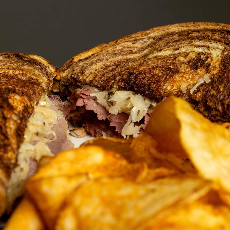 Corned beef, sauerkraut, swiss cheese, thousand island dressing on marble rye, served with 1 side